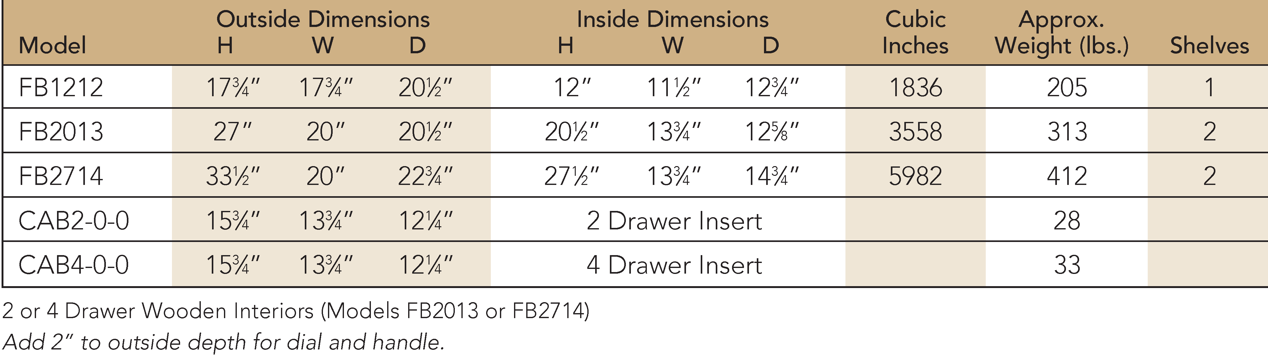 -Add 2” to outside depth for dial and handle. All safes have a UL RSC label and a 1 hour K.S. fire label. In addition models FB1212 and FB2013 have a UL 1 hour fire label.